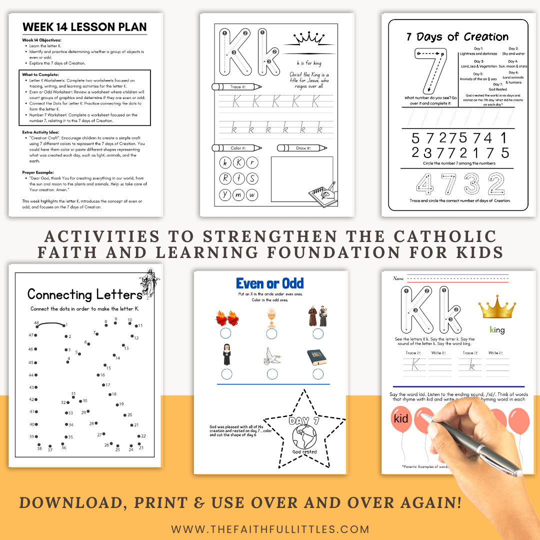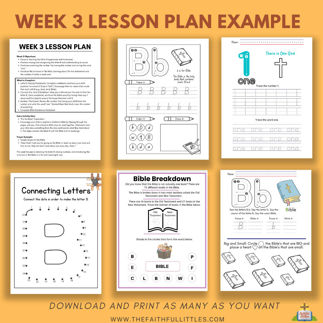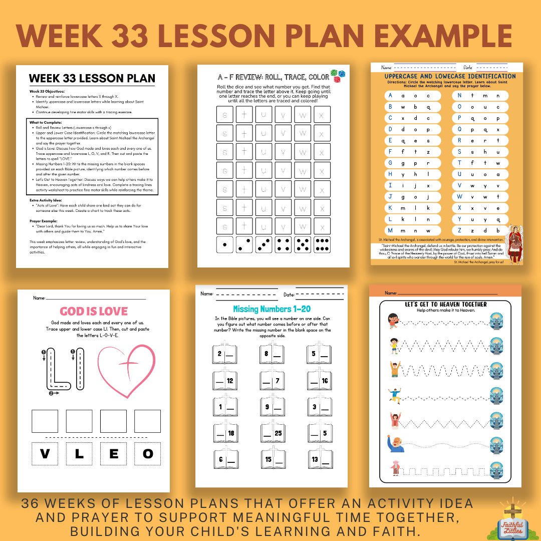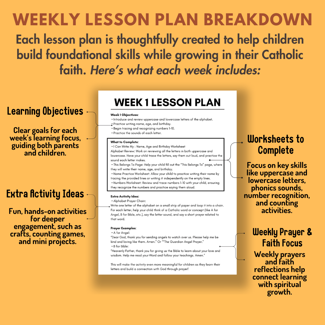 Lesson Plans for Every Week: Each week includes objectives, worksheets, extra activities, and a prayer example, making learning easy and impactful for you and your child.