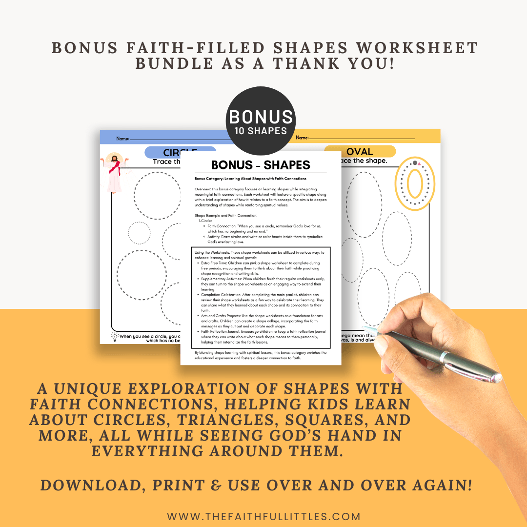 Bonus Shapes Section: A unique exploration of shapes with faith connections, helping kids learn about circles, triangles, squares, and more, all while seeing God’s hand in everything around them.