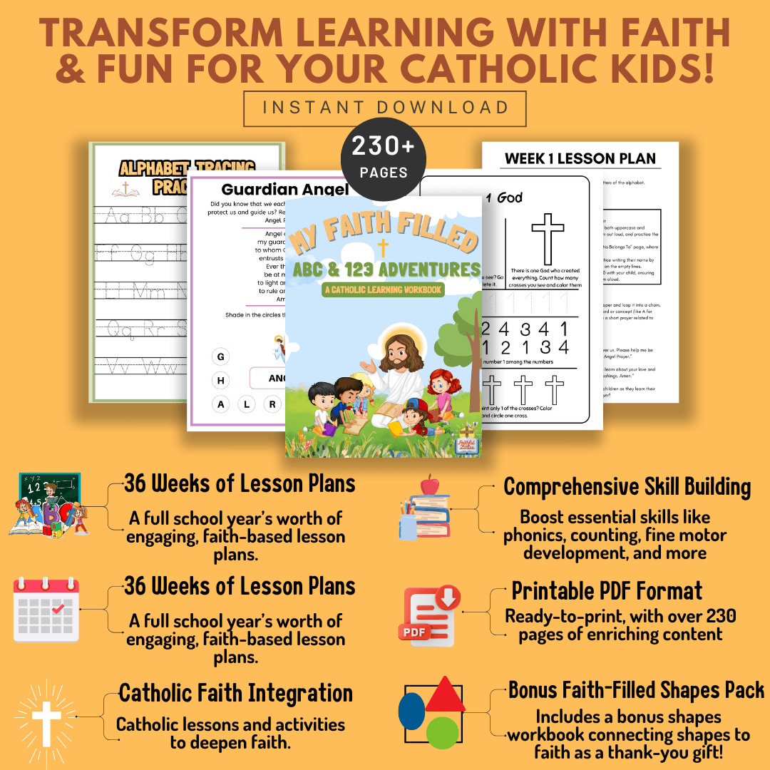 This Catholic children's workbook is a must-have for parents who want a meaningful, educational, memorable and Catholic faith-centered experience for their kids. Upon purchase, a digital download will be sent straight to your inbox, ready to print and start right away!